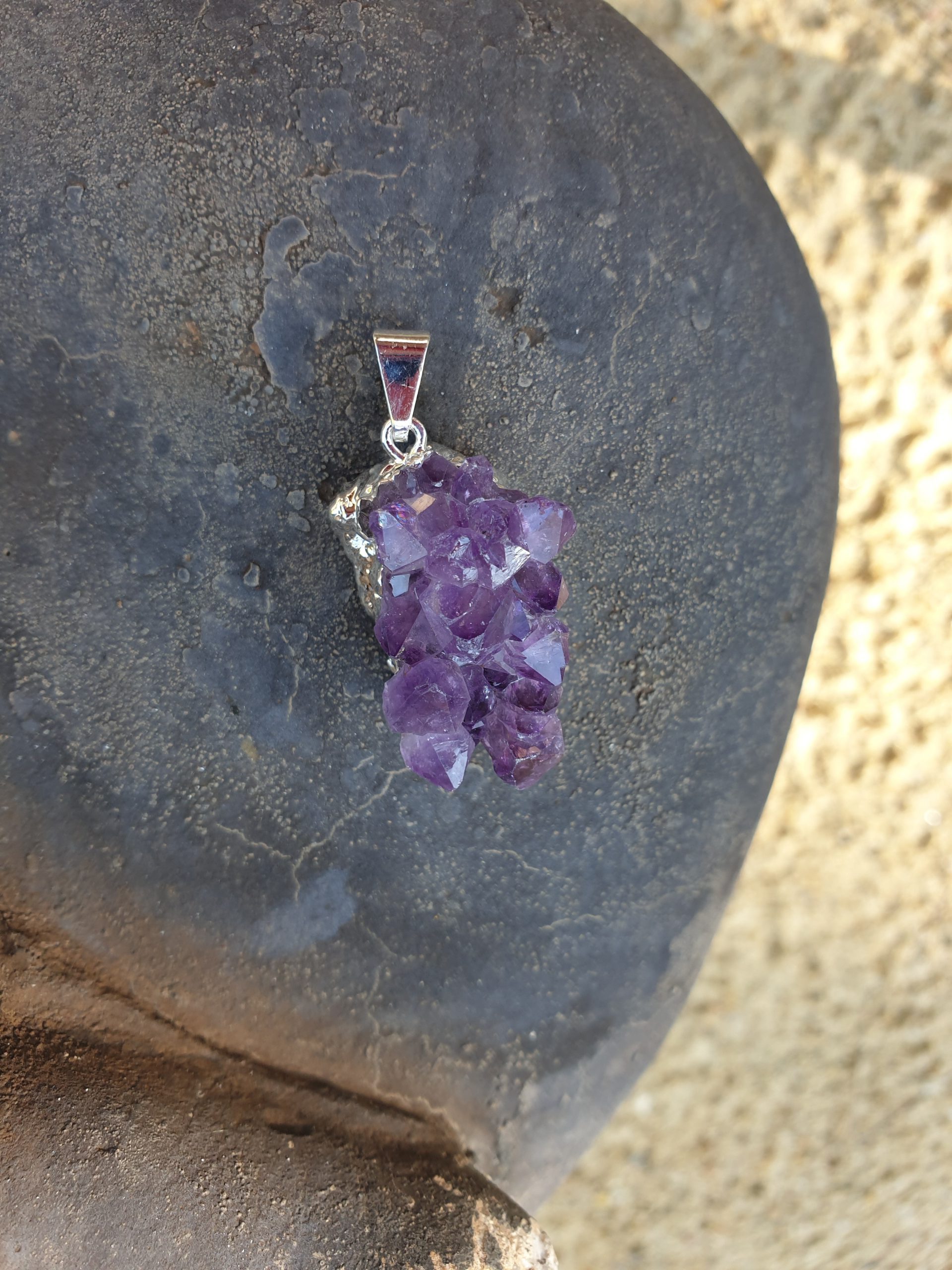 Colgantes drusa amatista con borde plateado mediante baño electrolítico.