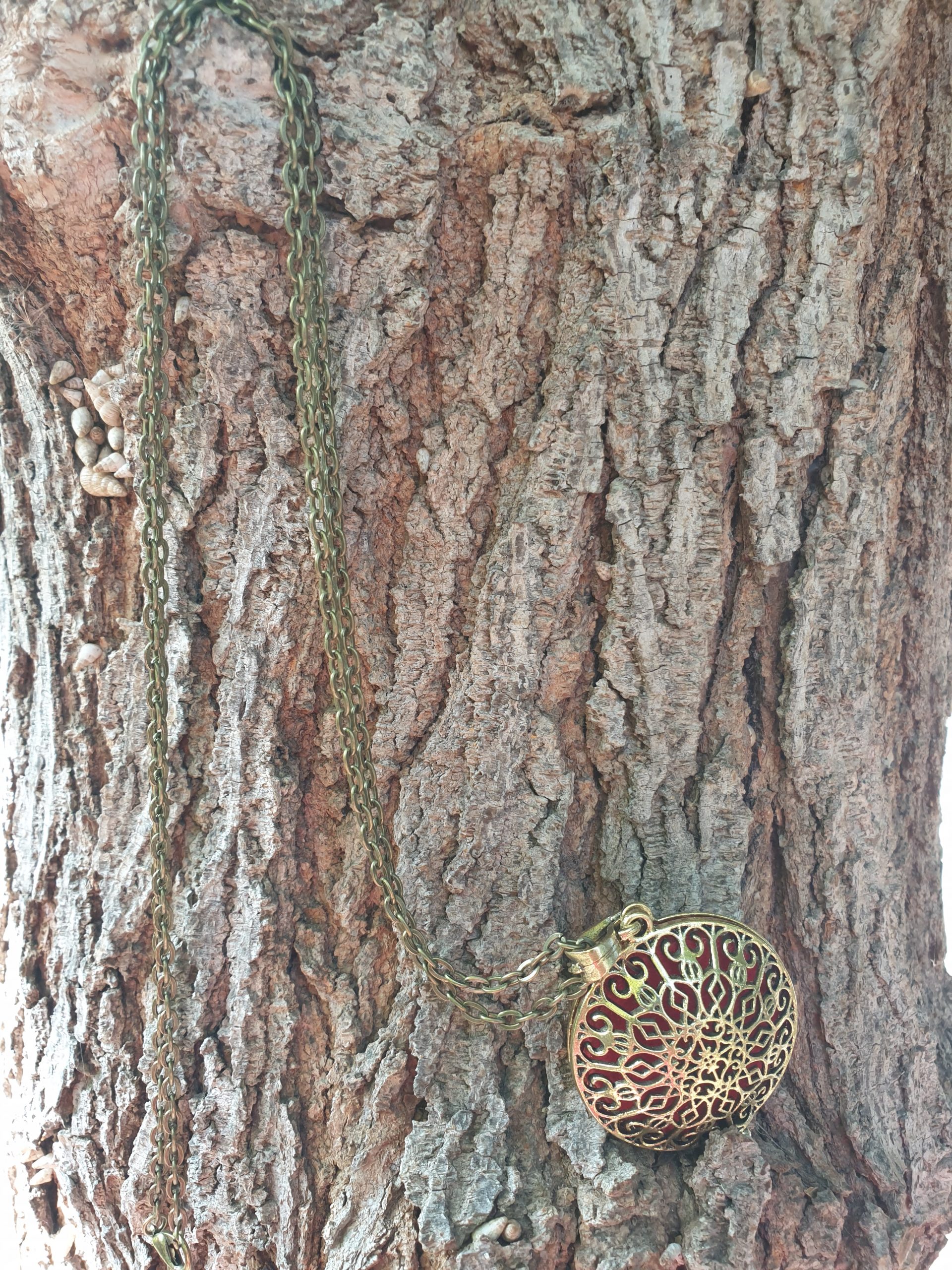 Collar jaula difusor de aceites esenciales con un dico en su interior para aplicar los aceites.