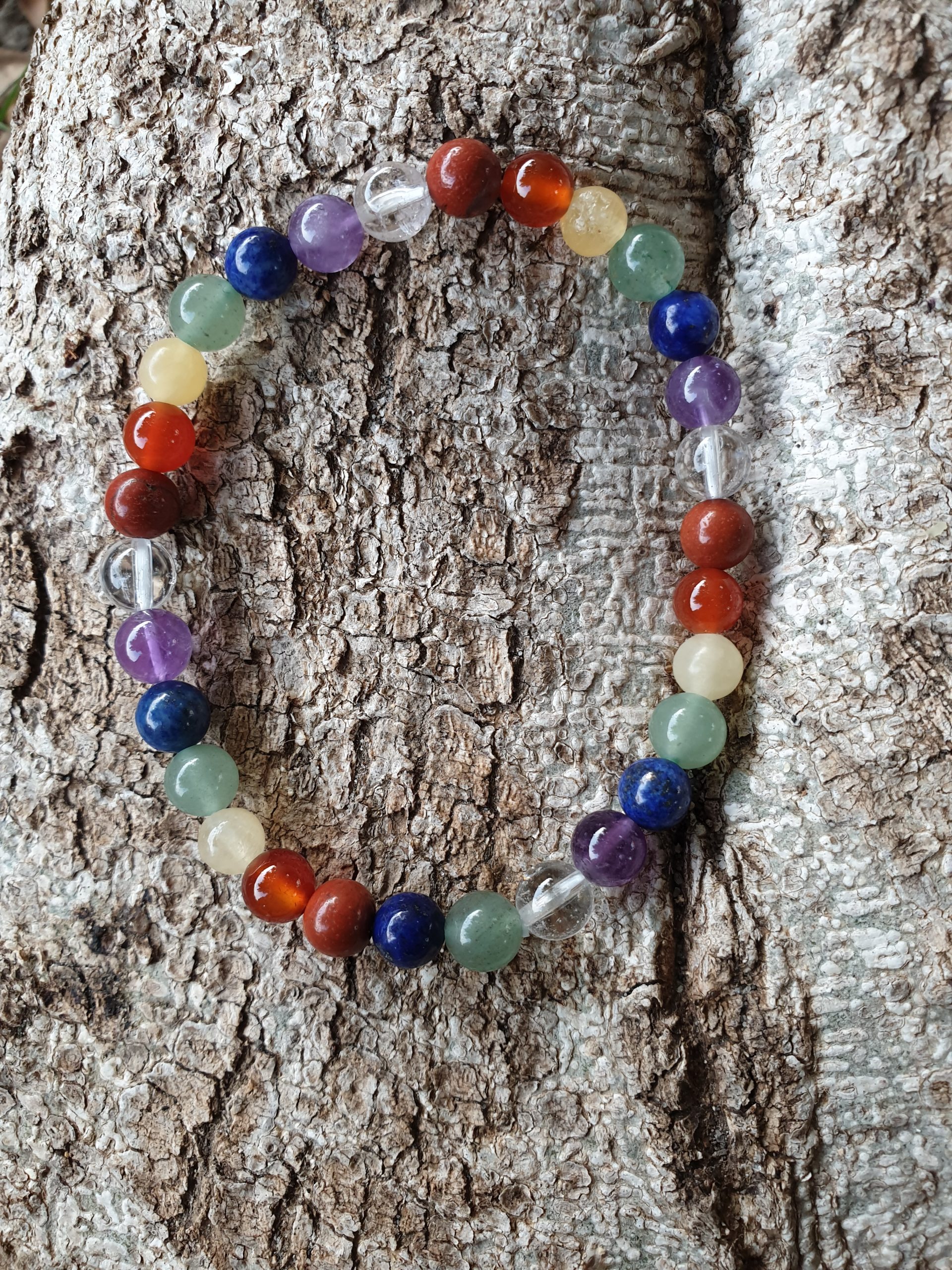 Minerales: Cuarzo cristal de roca, amatista, lapislázuli, cuarzo verde, calcita amarilla, cornalina, y ágata roja.